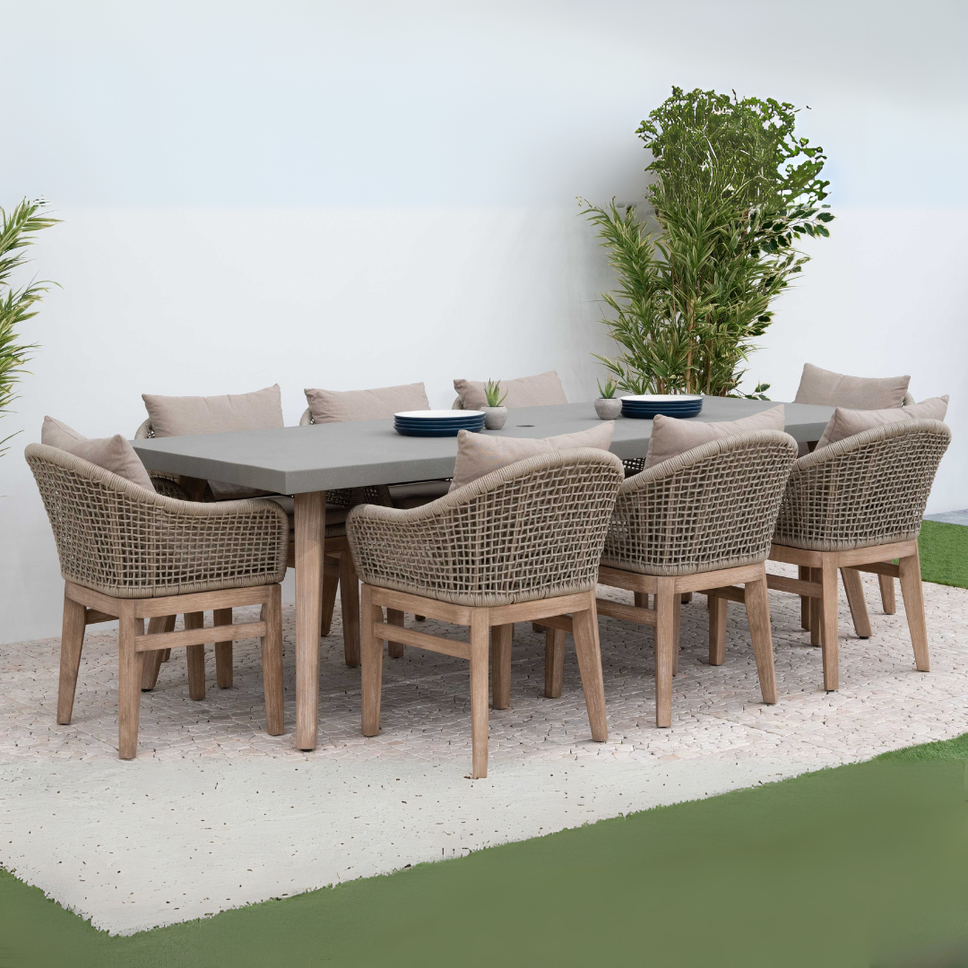 Designed with relaxation in mind, the Summer Collection includes high-specification olefin cushions, offering exceptional comfort for outdoor seating. The generously sized seats ensure a luxurious lounging experience, making it perfect for entertaining or unwinding. The polycrete tabletop adds a modern, low-maintenance touch with a rust-free design, while the incorporation of acacia wood provides a warm, natural aesthetic. Together, these materials create a harmonious blend of timeless beauty.